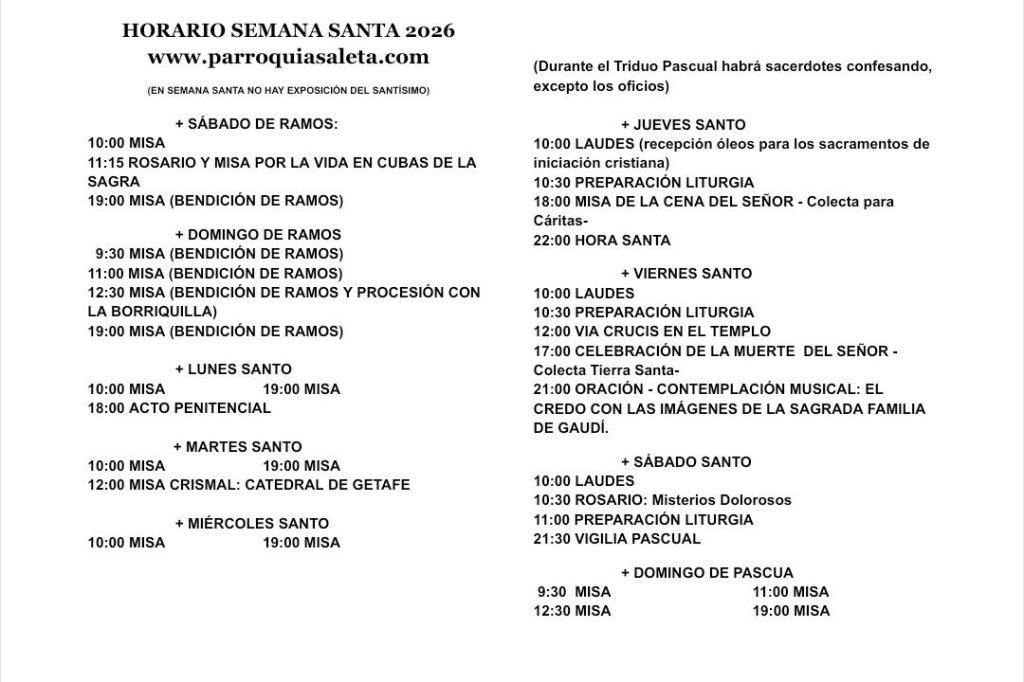 Plaza del Brasil, s/n, Alcorcón, 28921, Madrid – Diócesis de Getafe-: correo electrónico: nssaleta-alcorcon@diocesisgetafe.es Teléfono 916 197 098 – siguenos en Facebook: Parroquia-La-Saleta