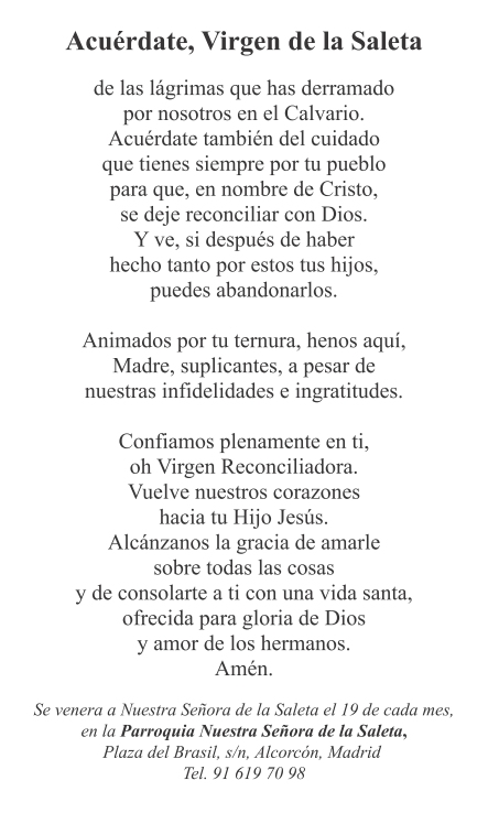 Estampa Nuestra Señora de la Saleta-r 21 julio, 2017 parroquiasaleta Publicado por parroquiasaleta Alcorcón, Madrid. Diócesis de Getafe. Ver todas las entradas de parroquiasaleta
